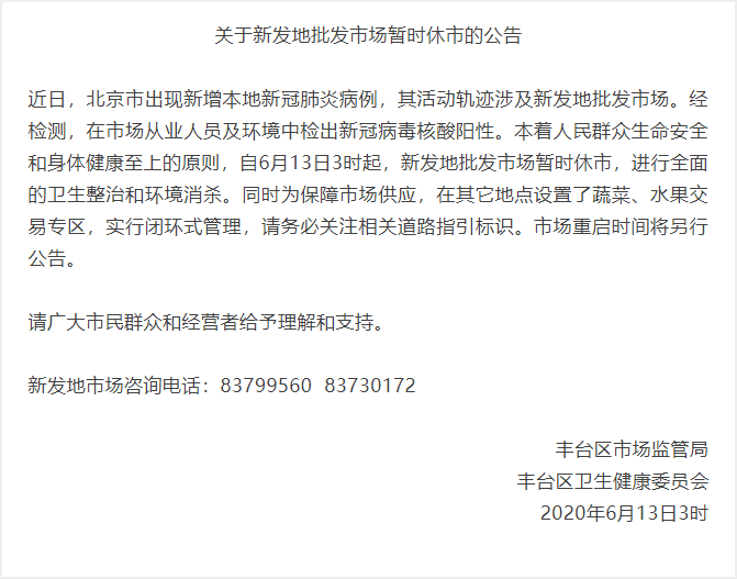 據北京日報消息,13日凌晨3時,豐臺區市場監管局、豐臺區衛生健康委員會發布消息:在市場從業人員及環境中檢出新冠病毒核酸陽性,自6月13日3時起,新發地批發市場暫時休市,進行全面的衛生整治和環境消殺。