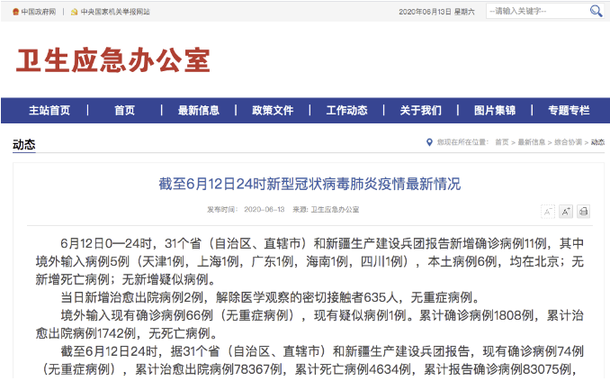 據國家衛生健康委員會官網消息,6月12日0—24時,31個省(自治區、直轄市)和新疆生產建設兵團報告新增確診病例11例,其中境外輸入病例5例(天津1例,上海1例,廣東1例,海南1例,四川1例),本土病例6例,均在北京;無新增死亡病例;無新增疑似病例。